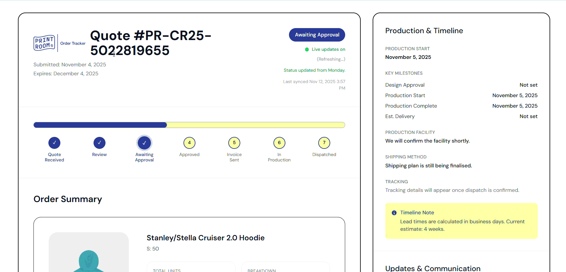 A customer-facing tracking experience that translates internal production stages into a usable external timeline, with data syncing between Supabase, Monday.com, and Shopify-connected workflows.